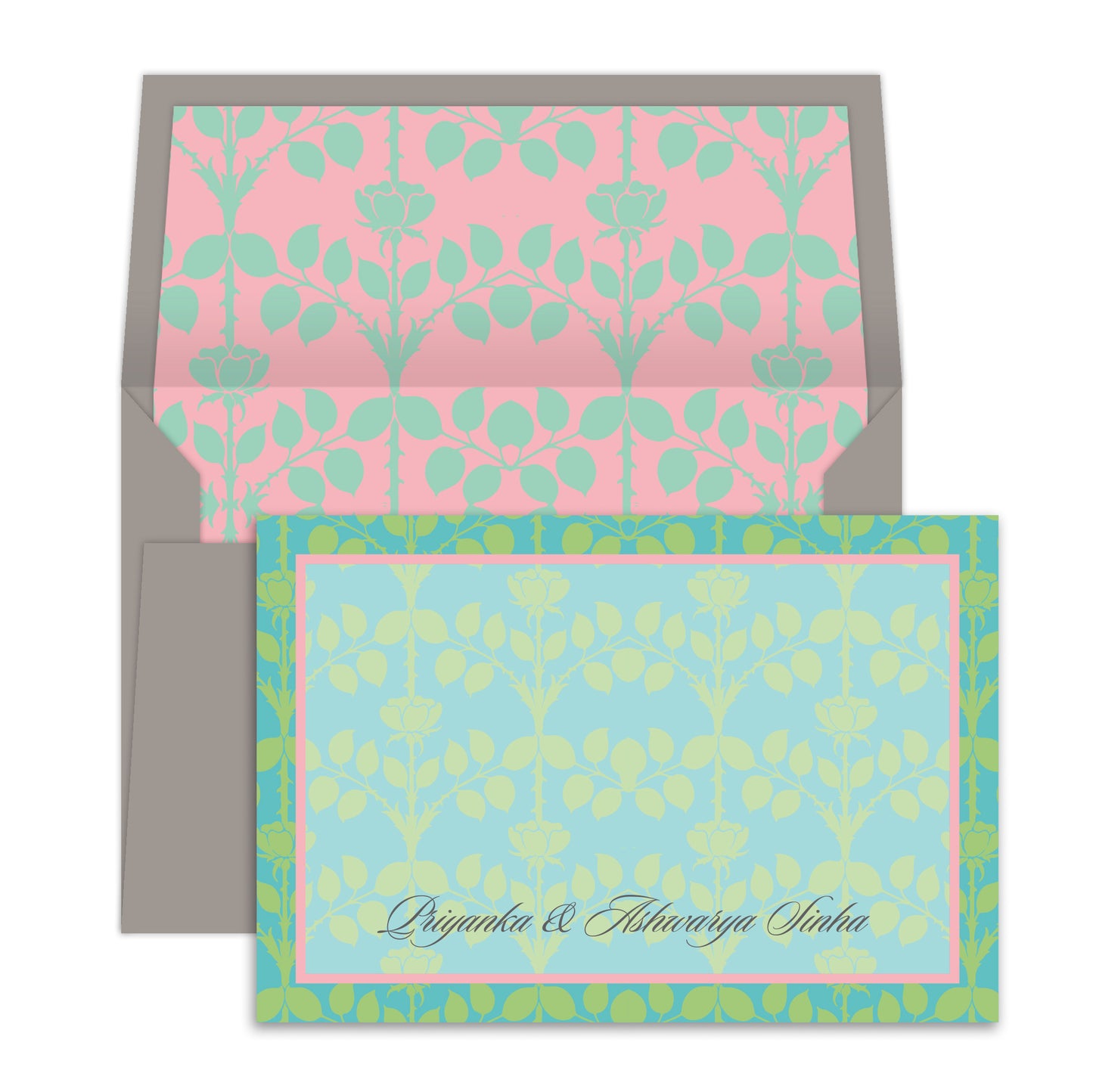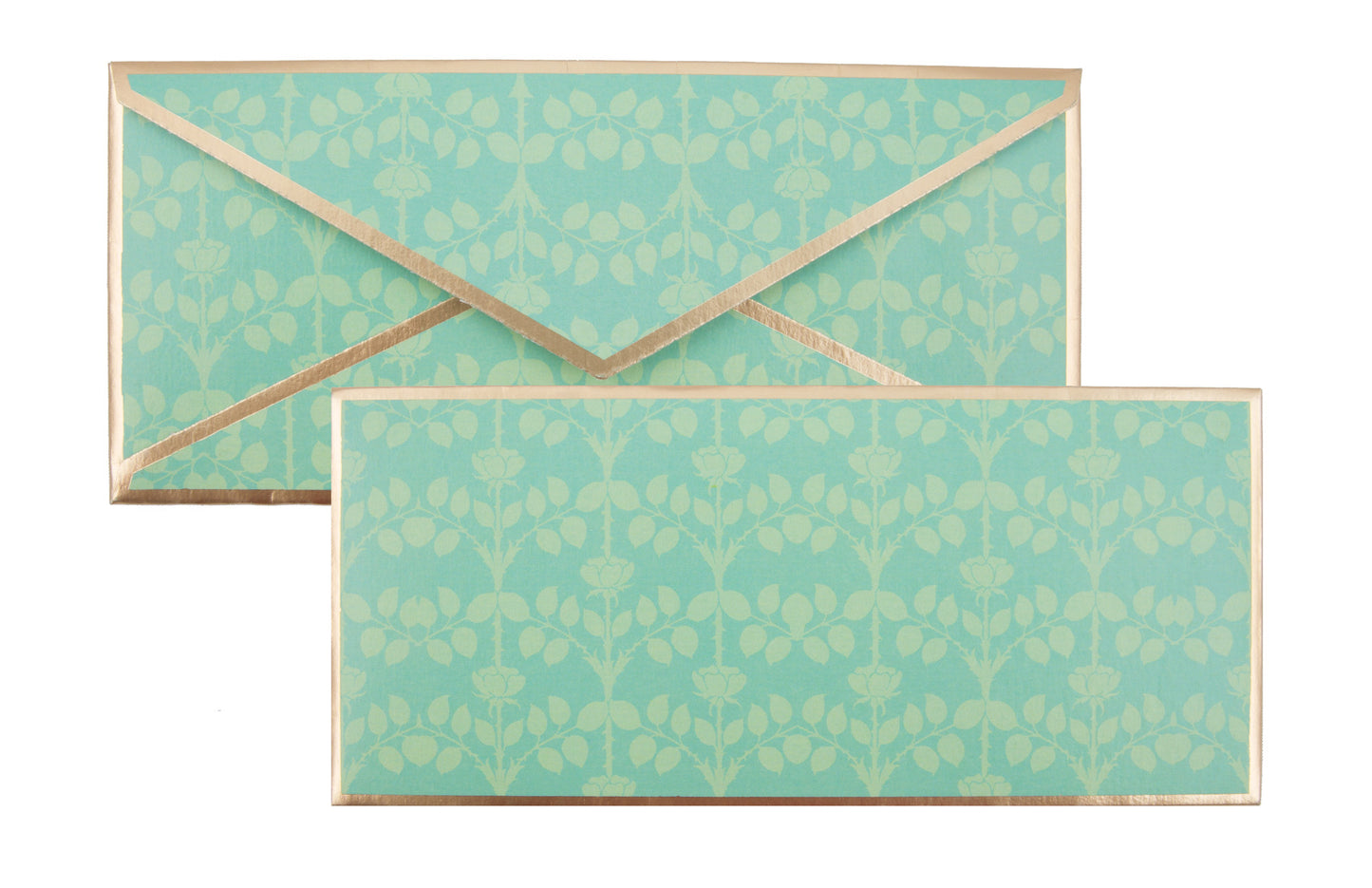 Roses pattern in shades of green. Complimented with motif and gold detailing on the gift envelope.