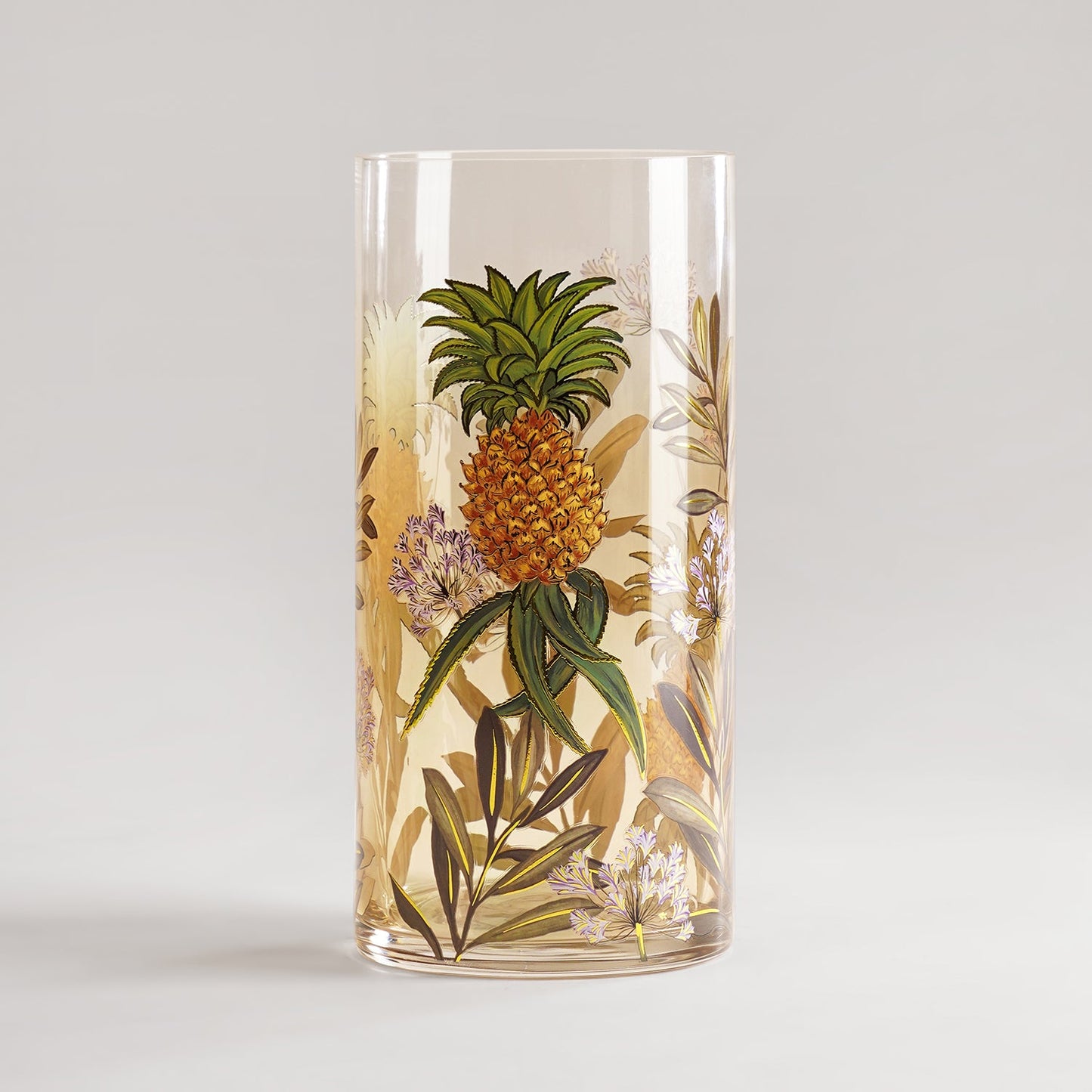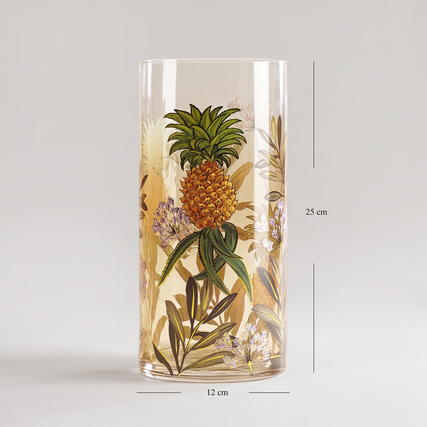 This stunning green cylindrical vase is adorned with intricate gold botanical motifs for an elegant finish. Its refreshing floral design adds a pop of colour and sophistication to your table, console, or festive decor.