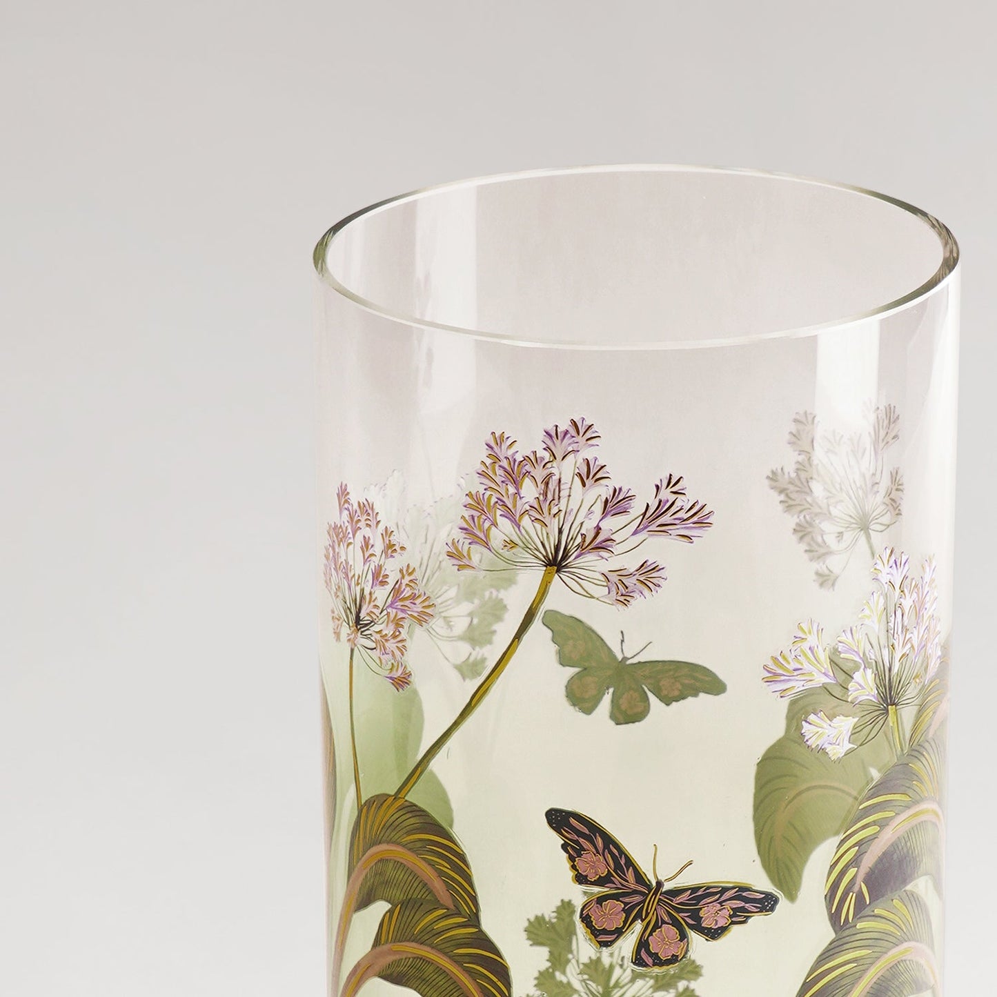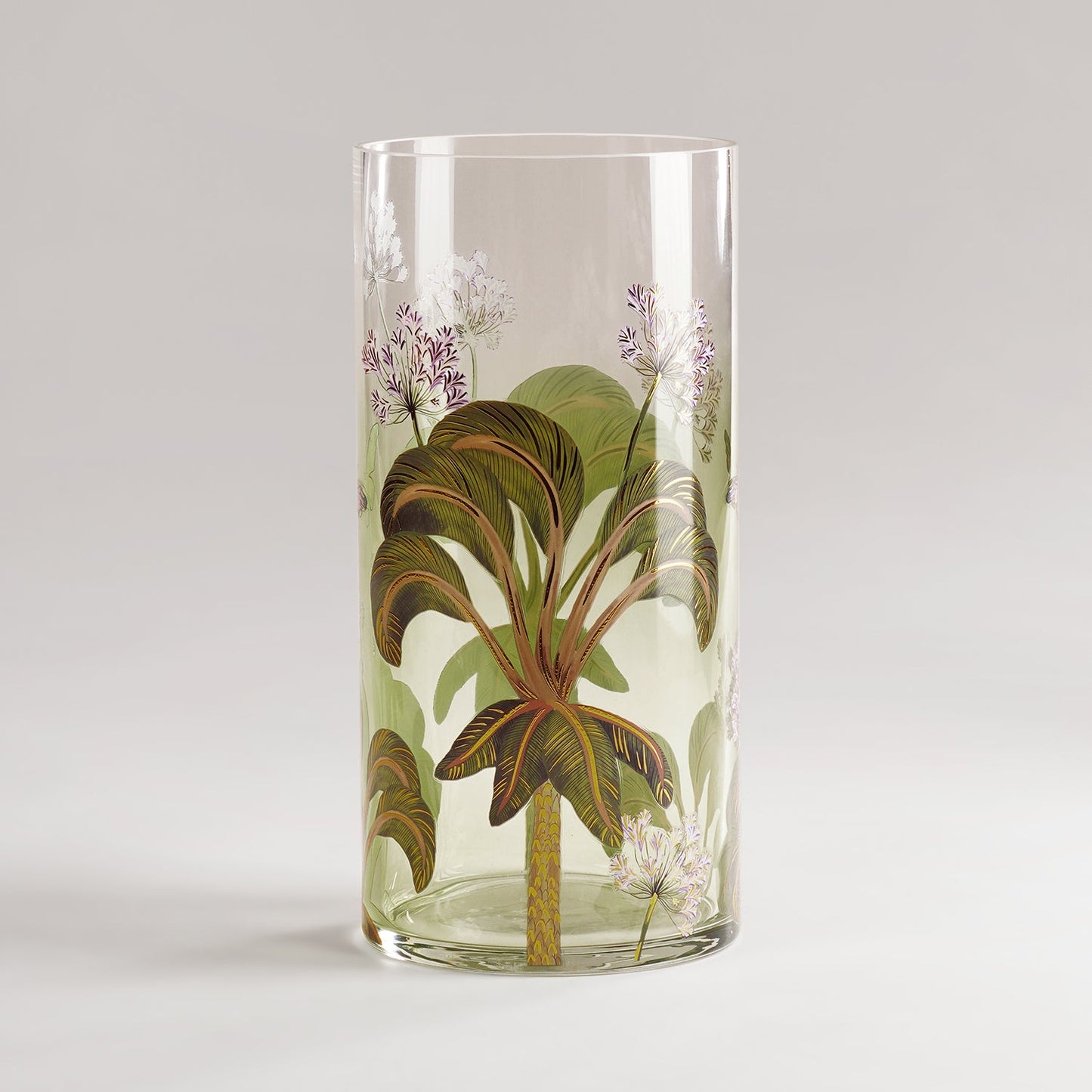 This stunning green cylindrical vase is adorned with intricate gold botanical motifs for an elegant finish. Its refreshing floral design adds a pop of colour and sophistication to your table, console, or festive decor.