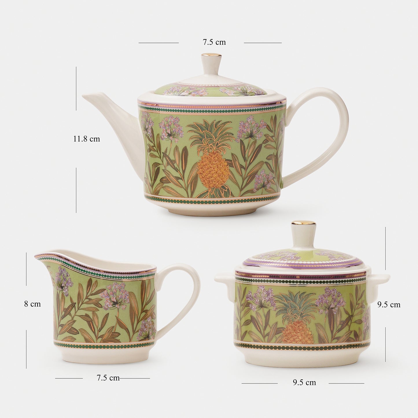 This green pineapple print tea pot, creamer and sugar pot features tropical botanical designs. A charming and elegant addition to tea-time gatherings.