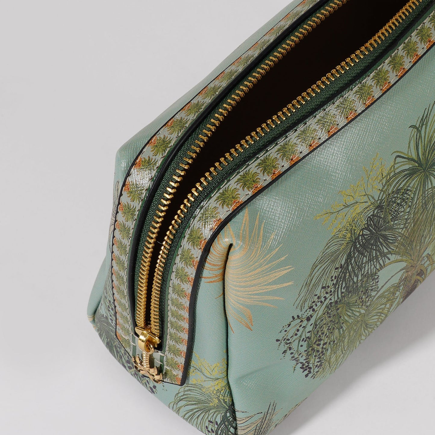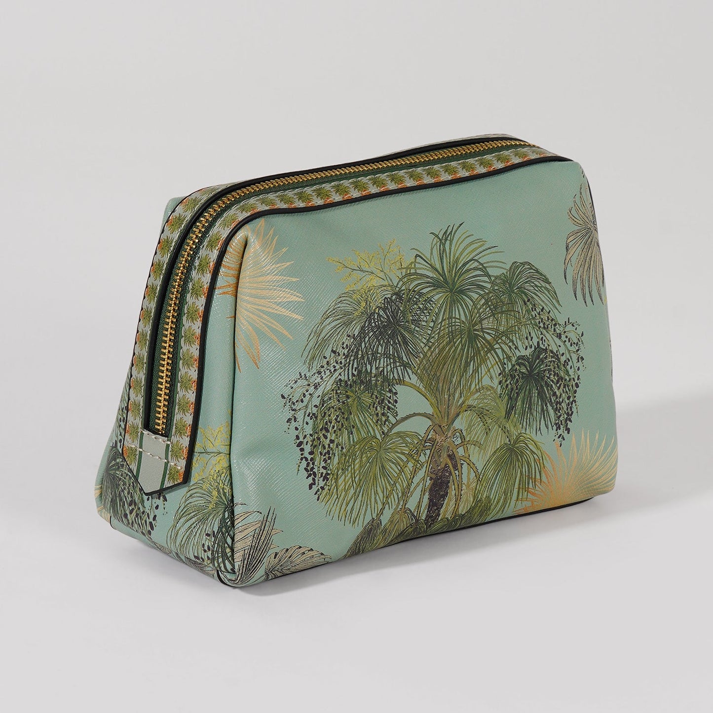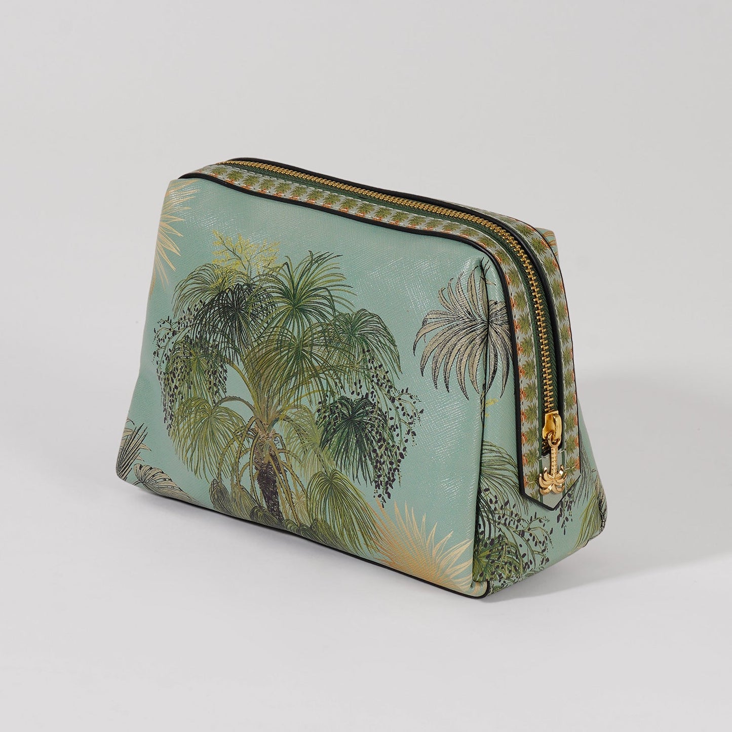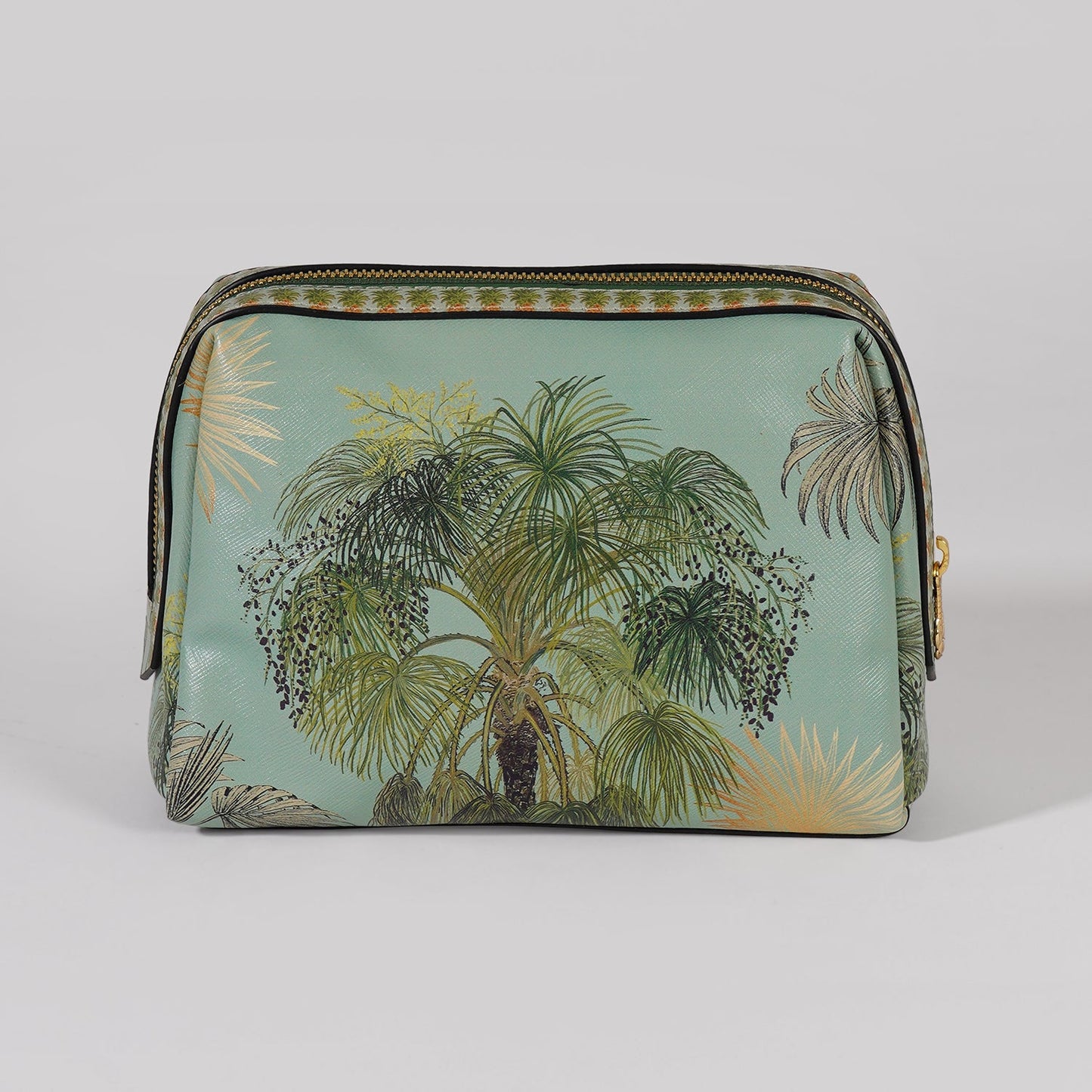 This tropical-themed zip pouch boasts a lush palm motif and elegant gold detailing, capturing a breezy, botanical vibe. Crafted with a structured form and secure zipper, its perfect for stylishly organizing your travel or daily essentials.
