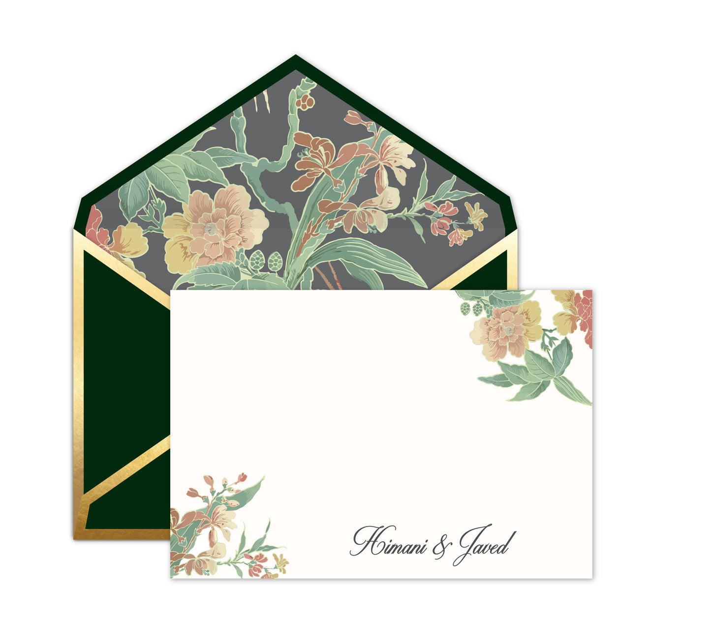 Beautiful notecards in sophisticated and elegant designs. This unique set has vibrant envelopes detailed with gold leaf.