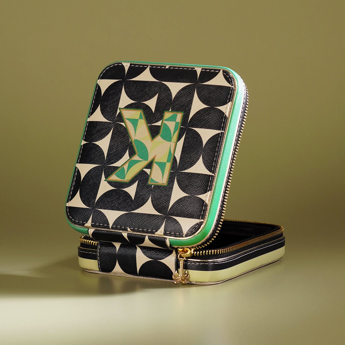Chic and compact, this black and green 'K' faux leather jewellery box keeps your treasures safe and tangle-free on the go. Its bold design and secure structure make it the perfect companion for stylish, organized travel.