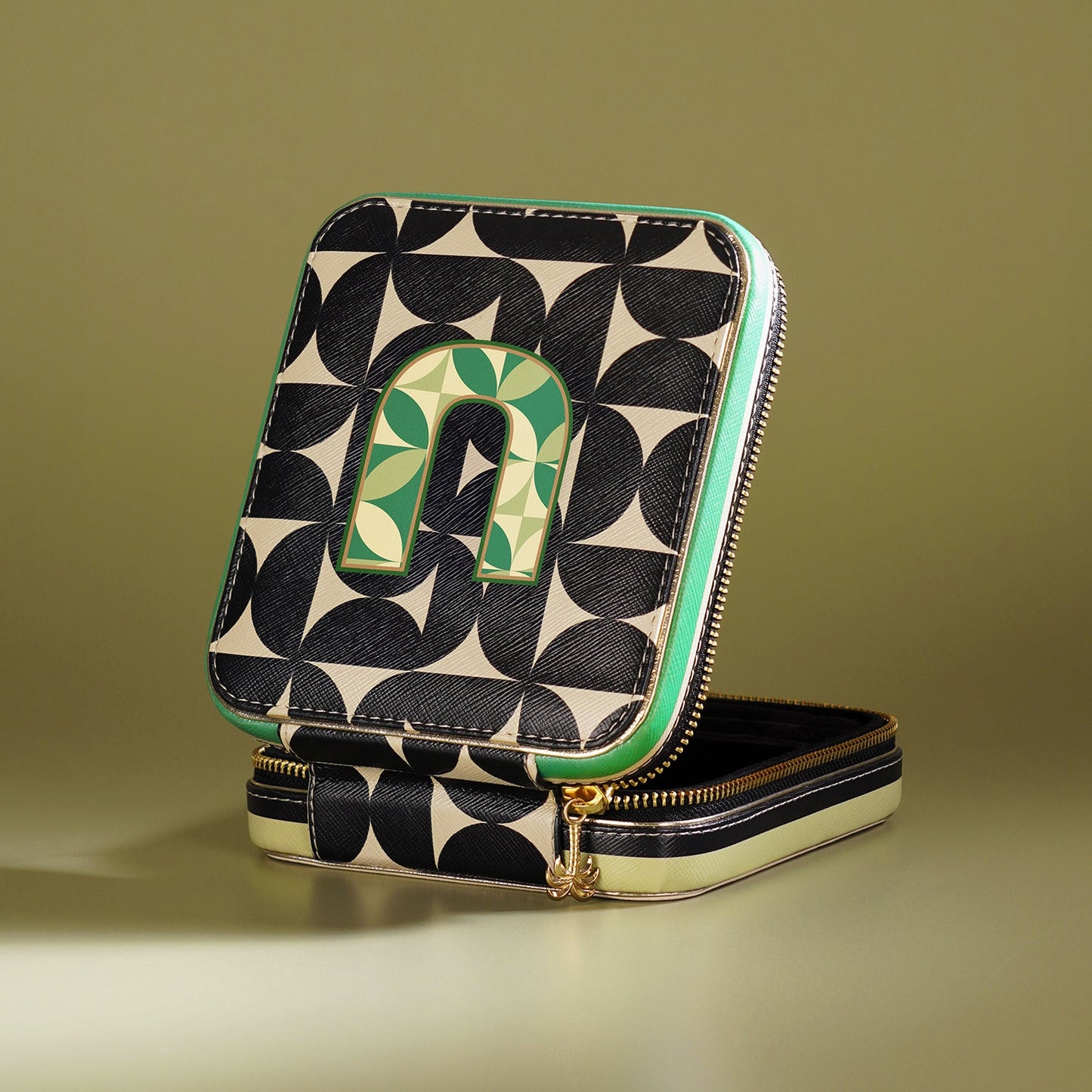 Chic and compact, this black and green 'U' faux leather jewellery box keeps your treasures safe and tangle-free on the go. Its bold design and secure structure make it the perfect companion for stylish, organized travel.