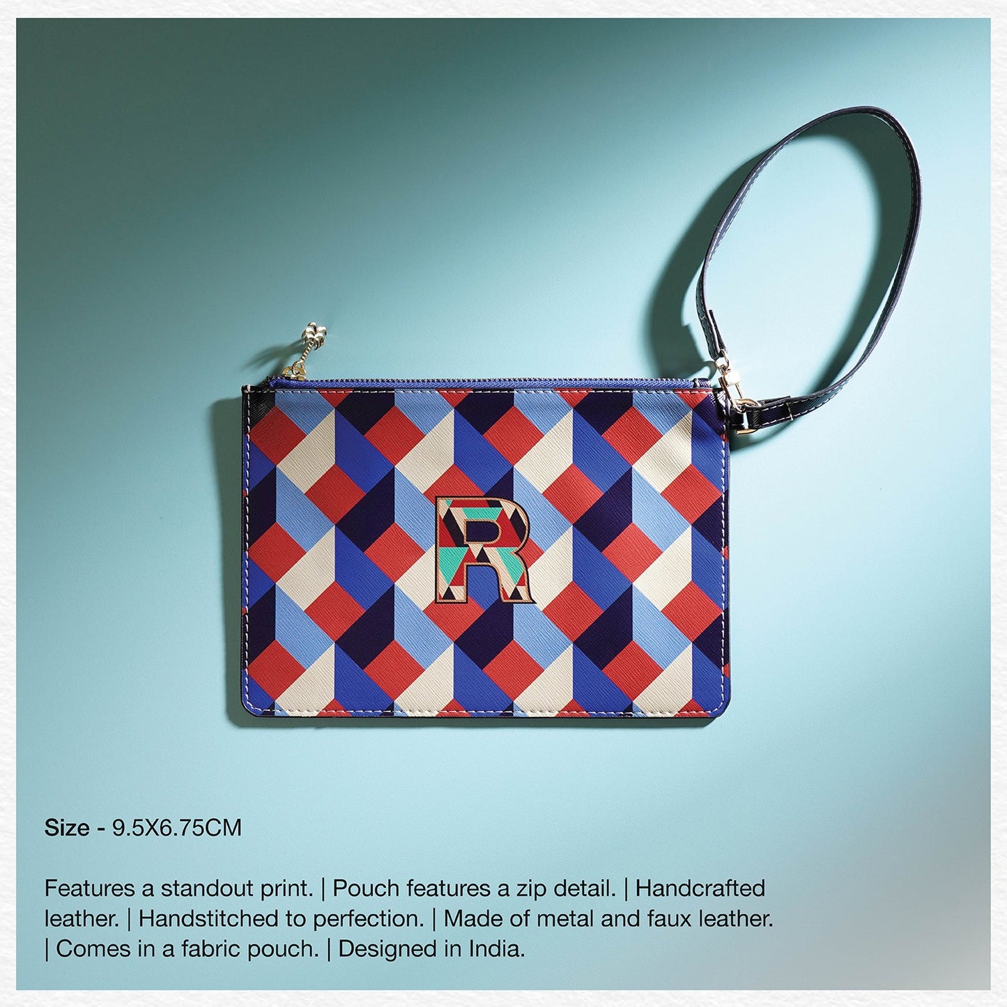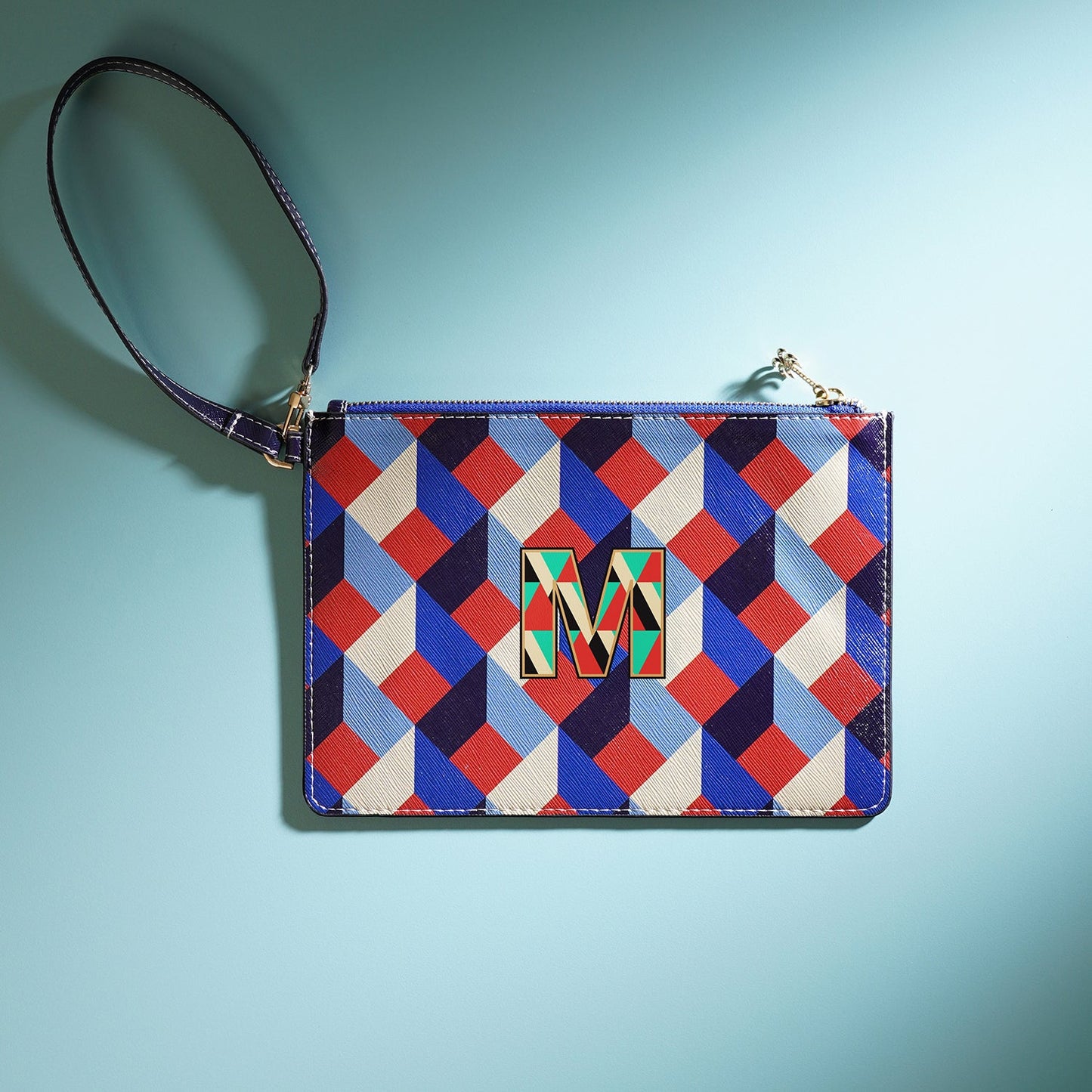 Sleek and versatile, the blue and peach 'M' flat travel pouch keeps your essentials organized with effortless style. Its bold design and compact form make it the perfect companion for every journey, near or far.