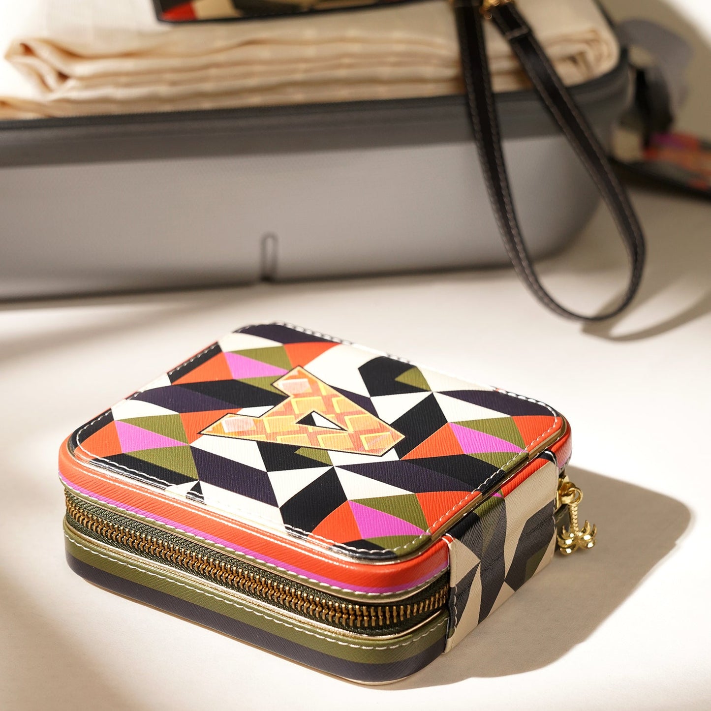 Chic and compact, this orange and pink 'V' faux leather jewellery box keeps your treasures safe and tangle-free on the go. Its bold design and secure structure make it the perfect companion for stylish, organized travel.