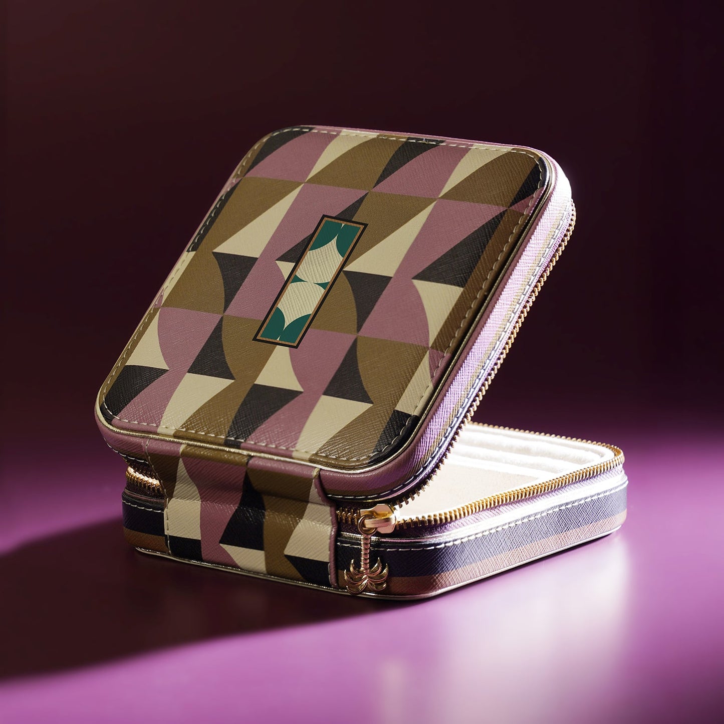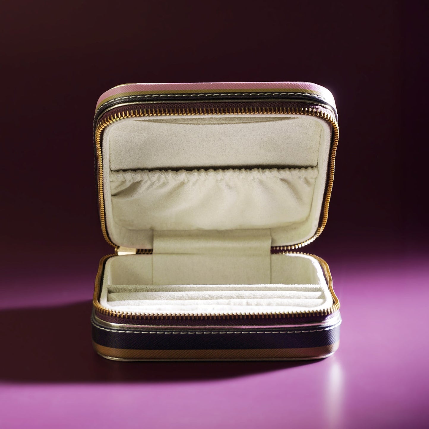 Chic and compact, this pink and green 'I' faux leather jewellery box keeps your treasures safe and tangle-free on the go. Its bold design and secure structure make it the perfect companion for stylish, organized travel.