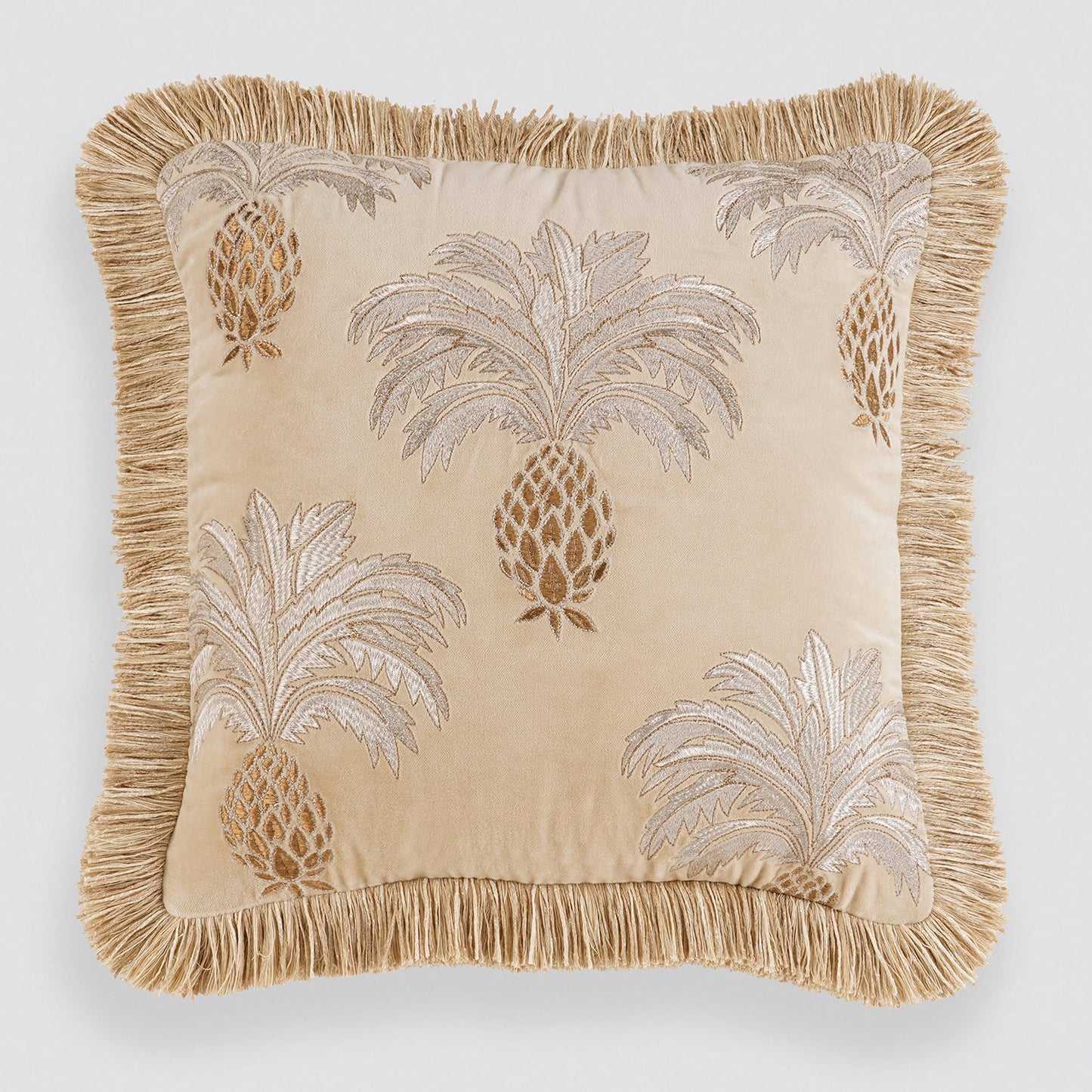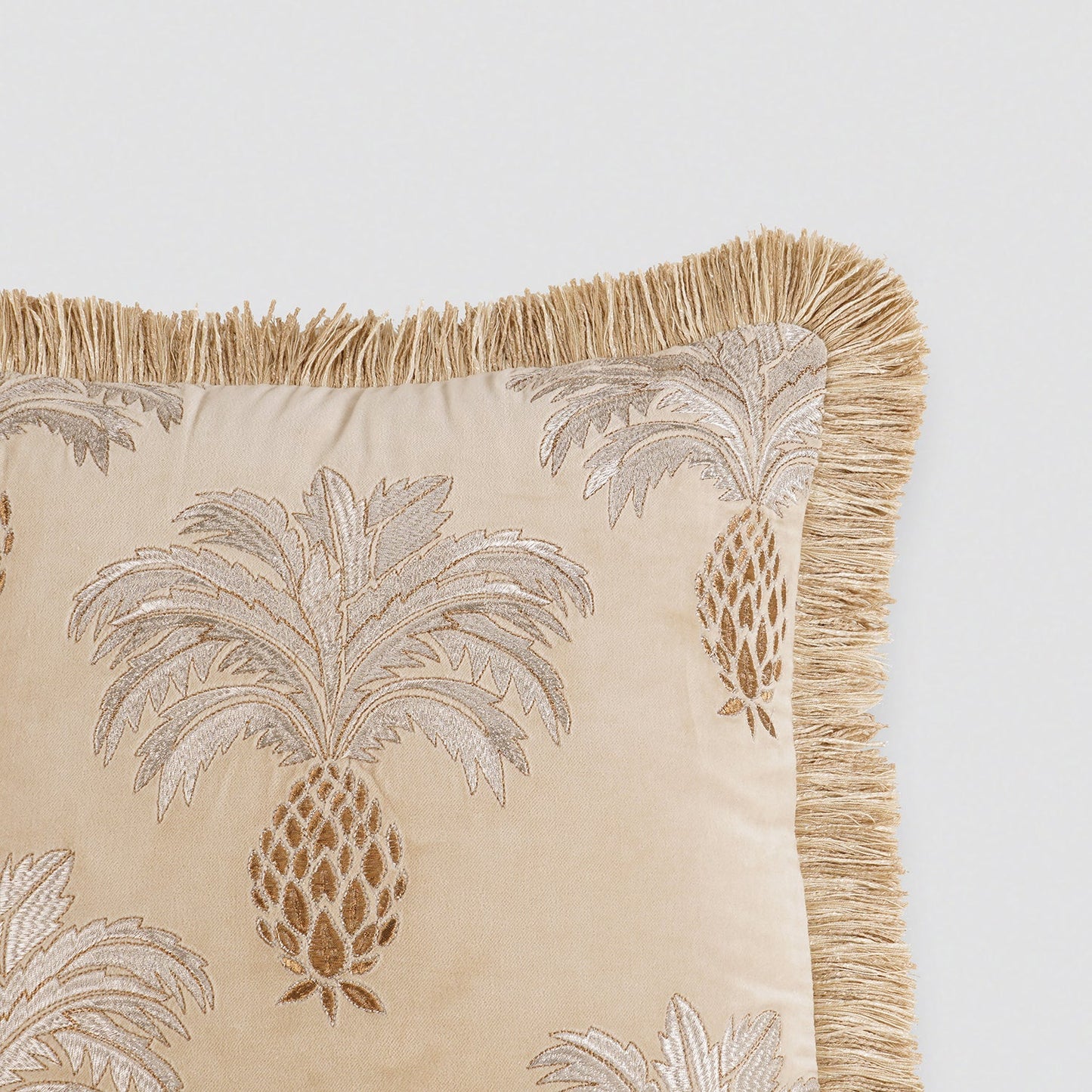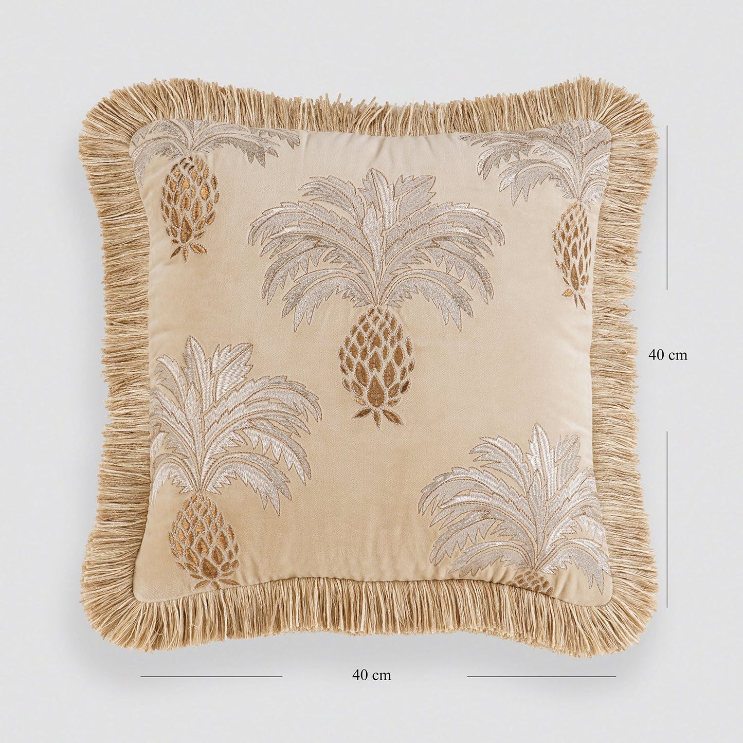 This elegant cushion features intricate pineapple and palm embroidery on a luxe beige fabric, framed with plush fringe detail. Its tropical motif and rich texture add a warm, sophisticated charm to any seating arrangement.