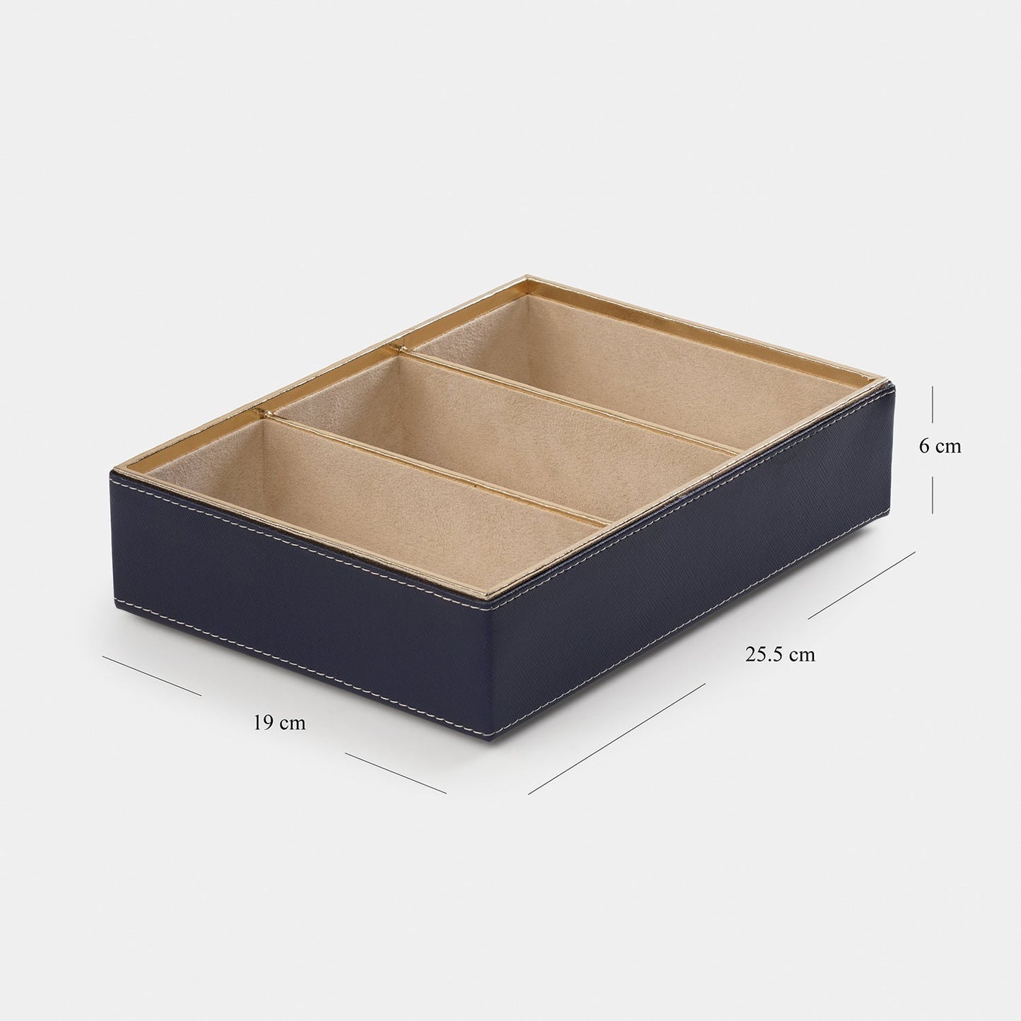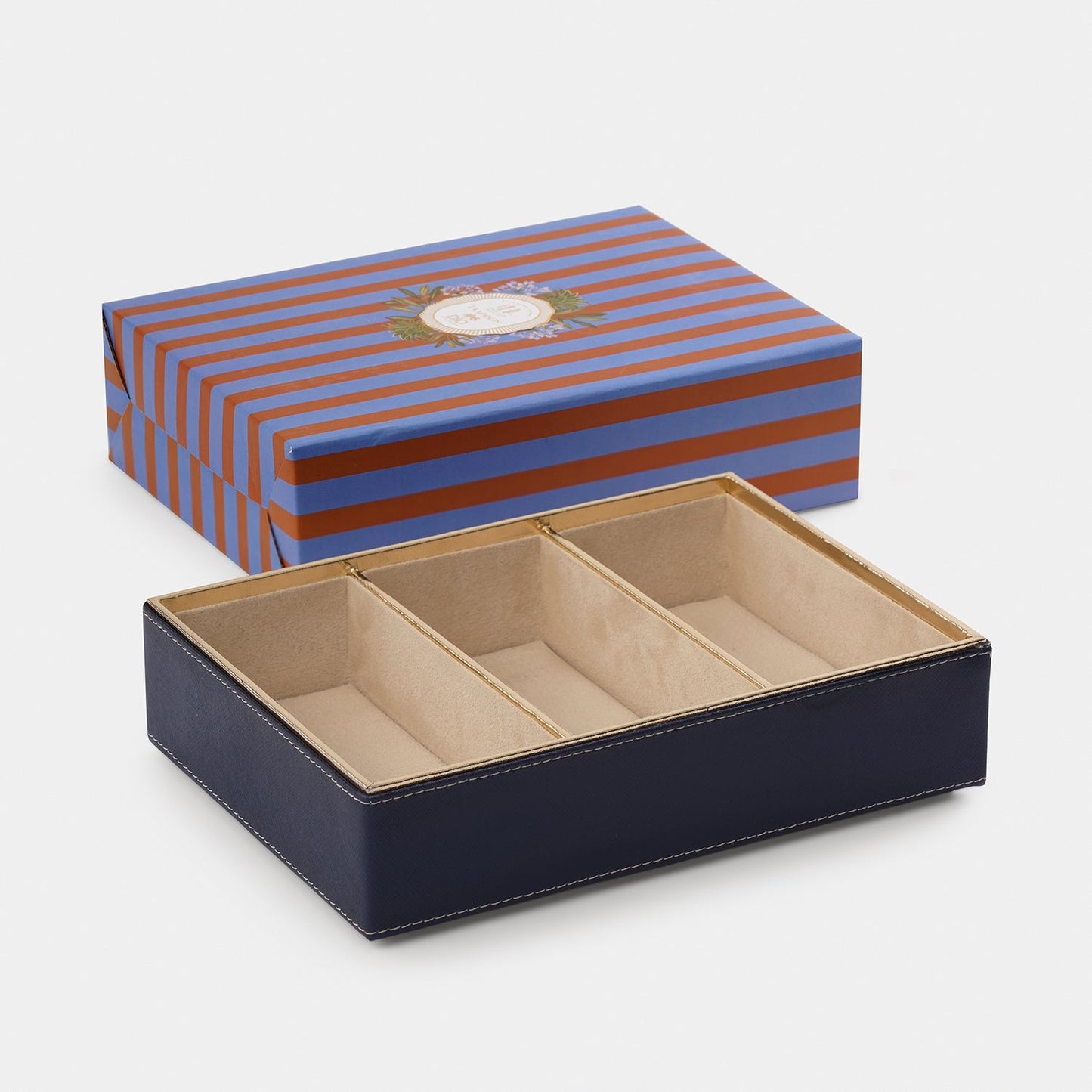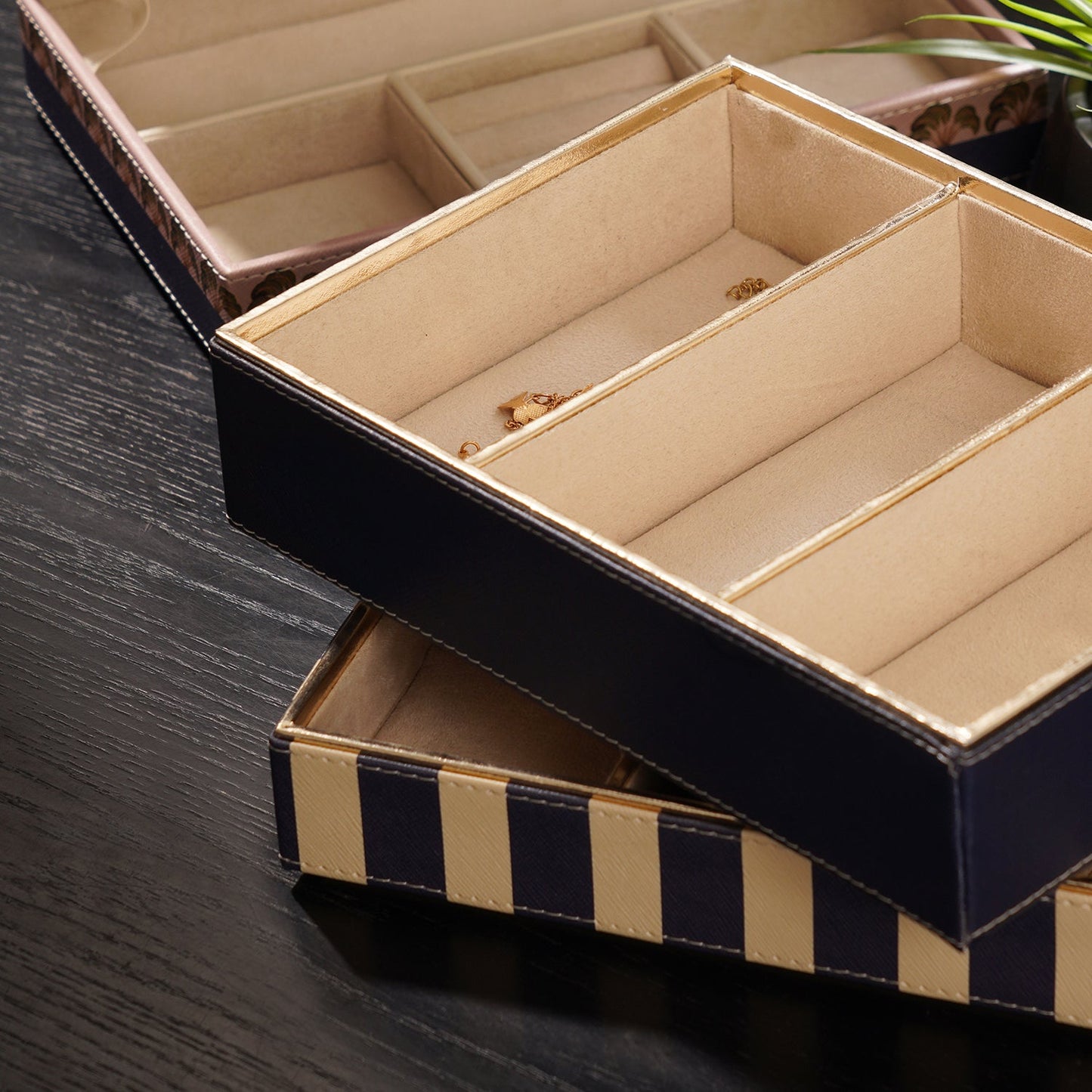 This blue solene 3-compartment organiser is a rectangular storage solution featuring a navy-and-cream striped exterior with gold detailing. The interior is lined with a soft beige finish and divided into four compartments, perfect for neatly arranging jewelry, accessories, or small essentials while adding a touch of elegance to any space.