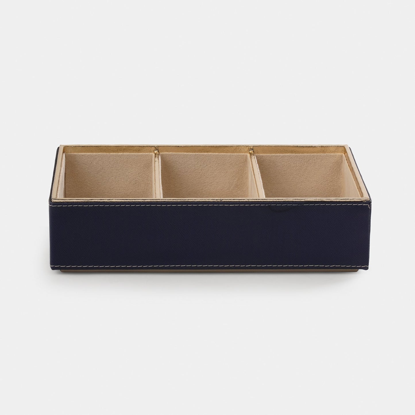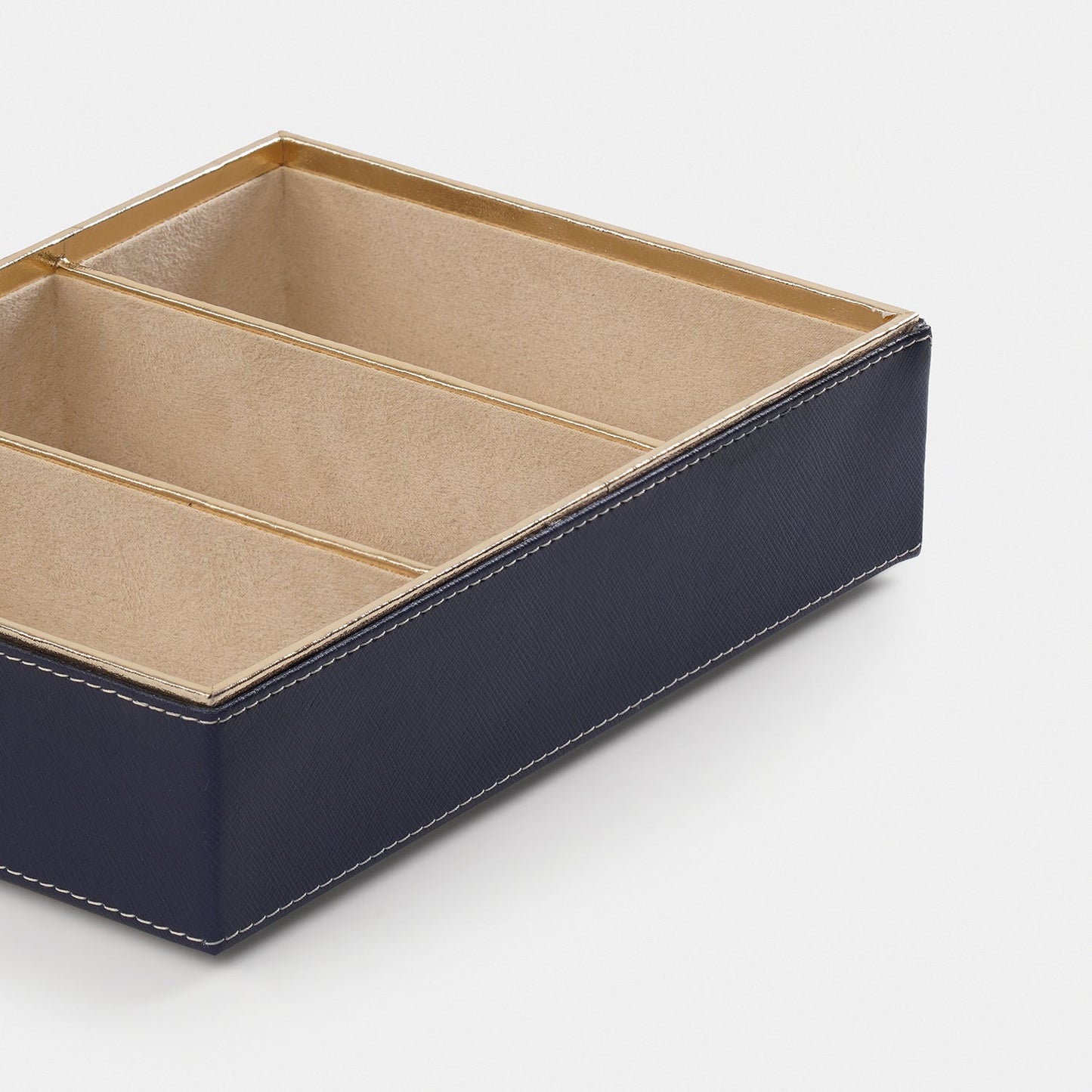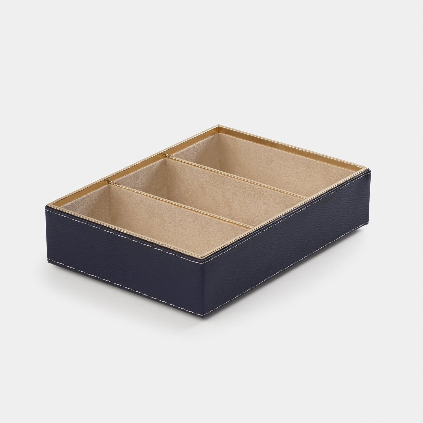 This blue solene 3-compartment organiser is a rectangular storage solution featuring a navy-and-cream striped exterior with gold detailing. The interior is lined with a soft beige finish and divided into four compartments, perfect for neatly arranging jewelry, accessories, or small essentials while adding a touch of elegance to any space.