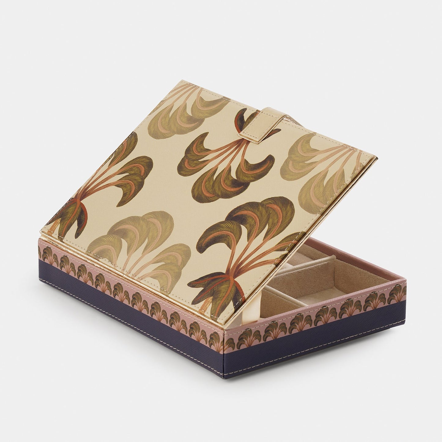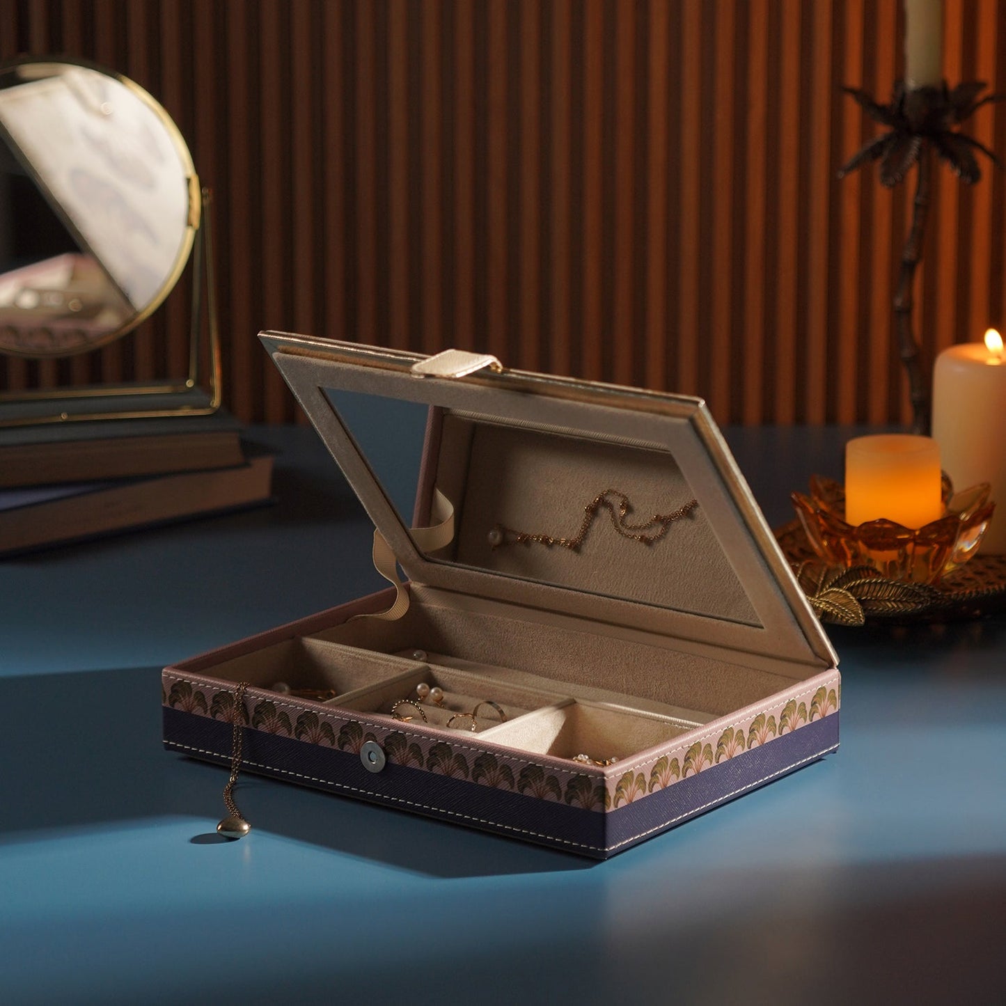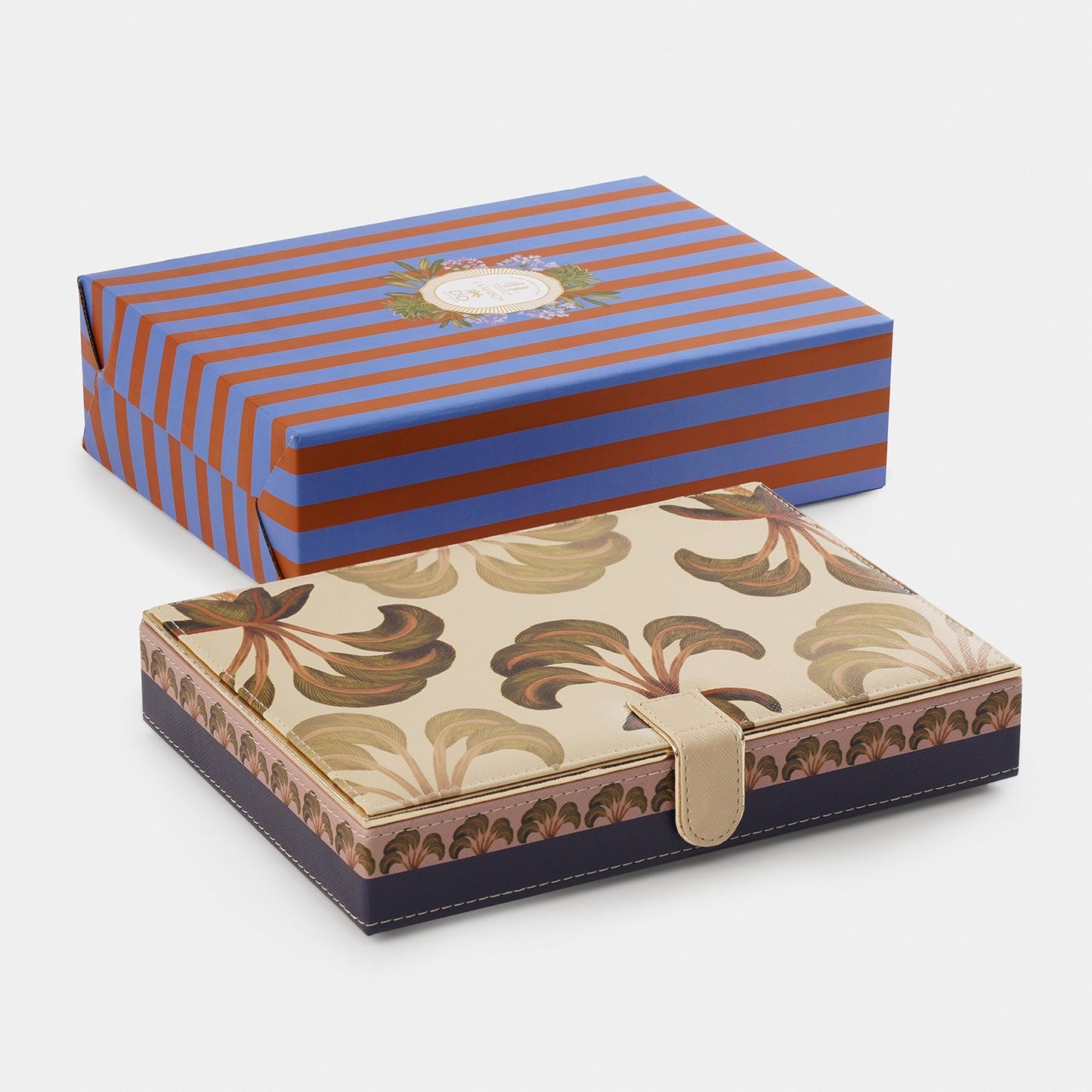 This blue solene faux leather jewellery box is a rectangular storage case featuring tropical leaf motifs on the top, bordered with intricate detailing and navy-and-cream striped edges. With its secure snap closure and elegant faux leather finish, it’s designed to organize and protect jewellery pieces, combining refined style with practical functionality.