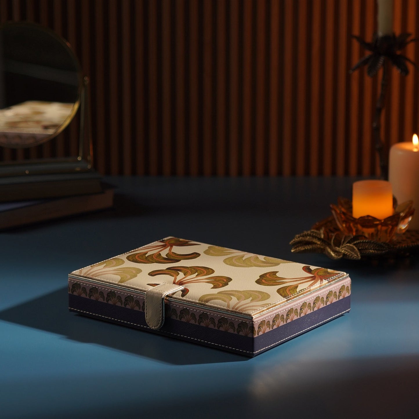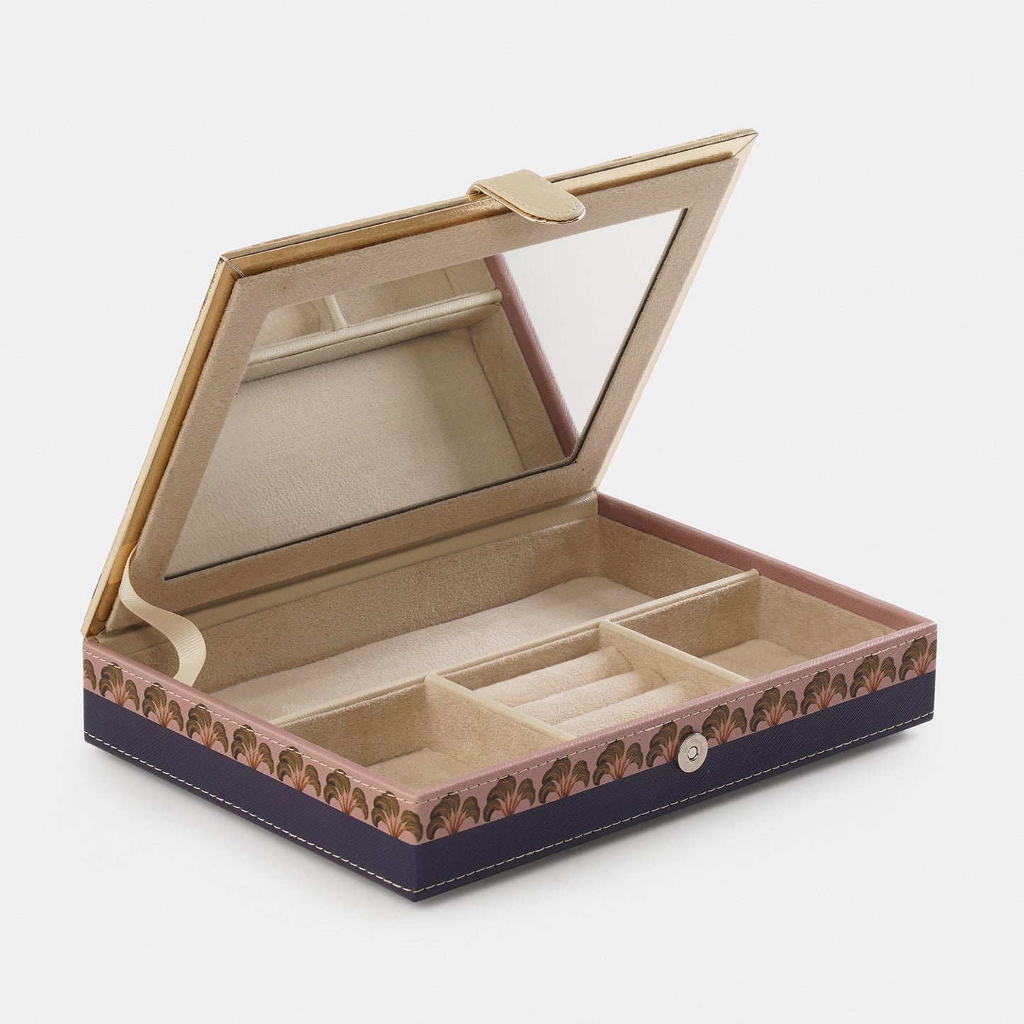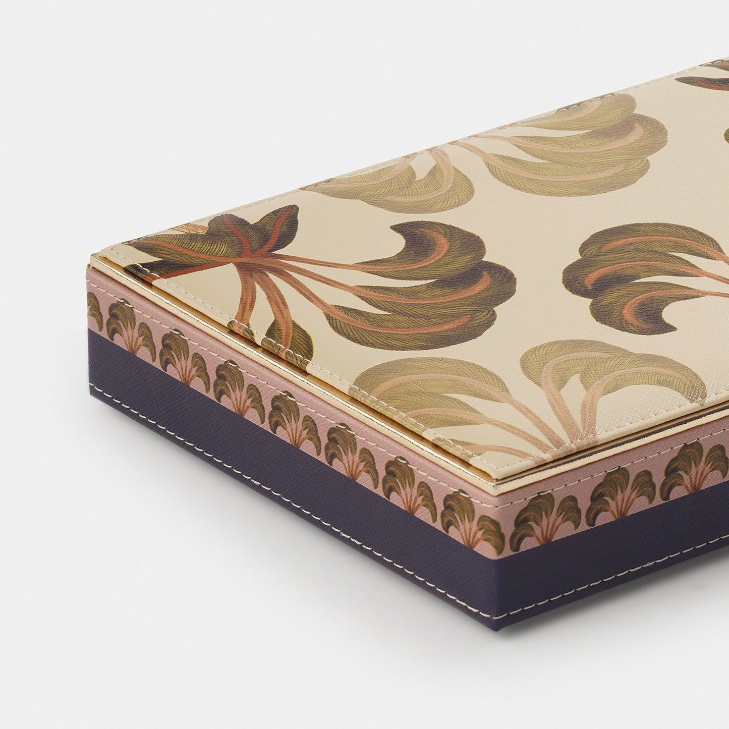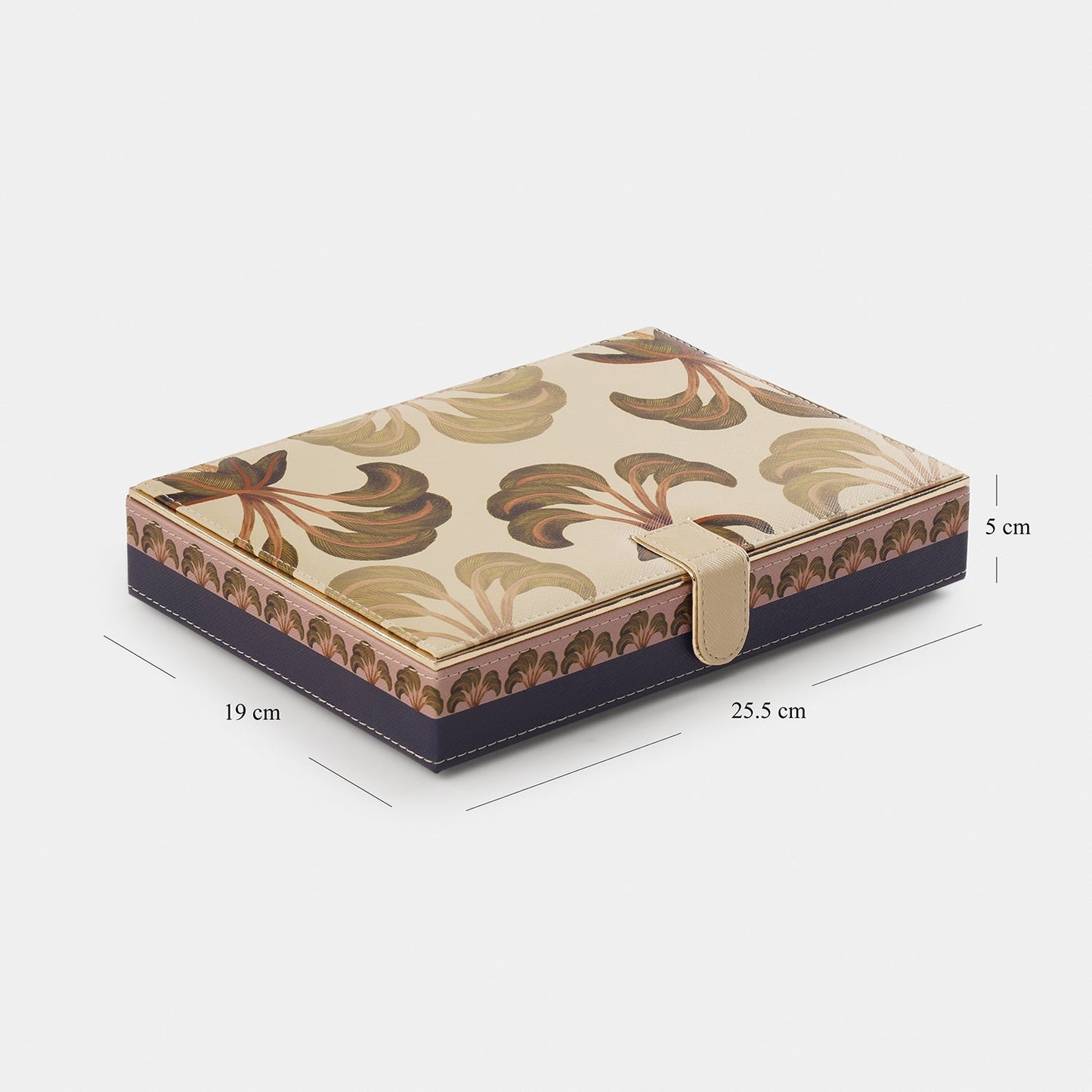 This blue solene faux leather jewellery box is a rectangular storage case featuring tropical leaf motifs on the top, bordered with intricate detailing and navy-and-cream striped edges. With its secure snap closure and elegant faux leather finish, it’s designed to organize and protect jewellery pieces, combining refined style with practical functionality.