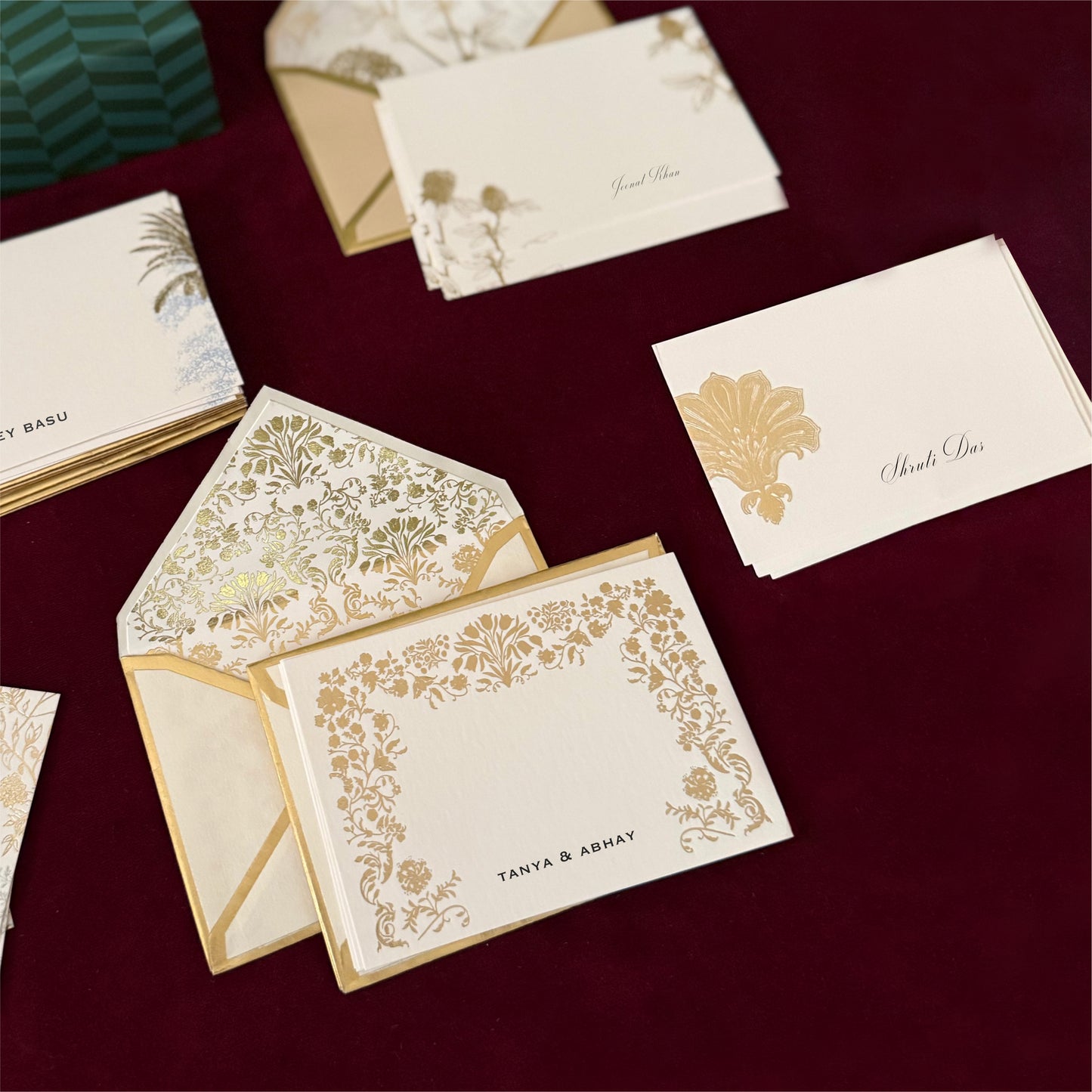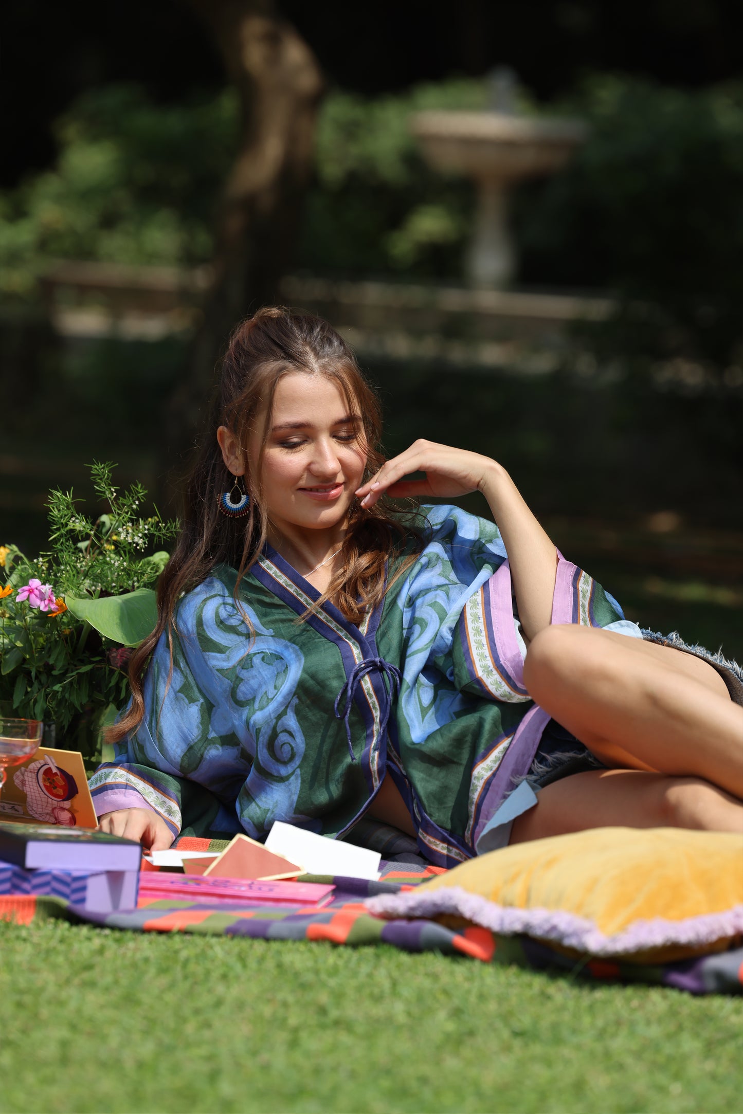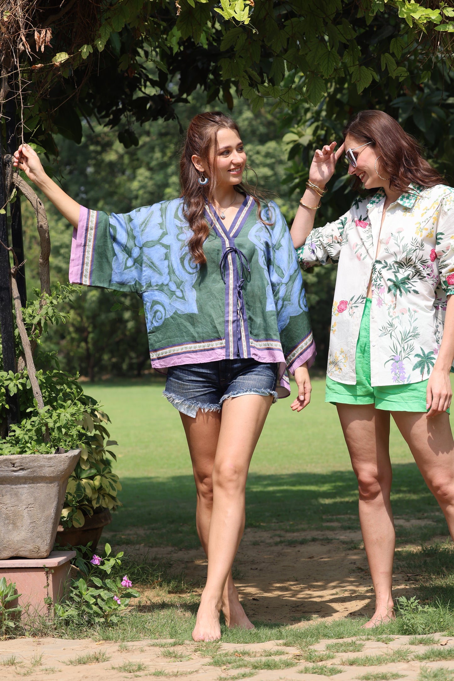 The Palmas print features a green base adorned with blue motif and a palm tree, elegantly bordered in mauve and detailed border, adding a touch of natural charm to any outfit.