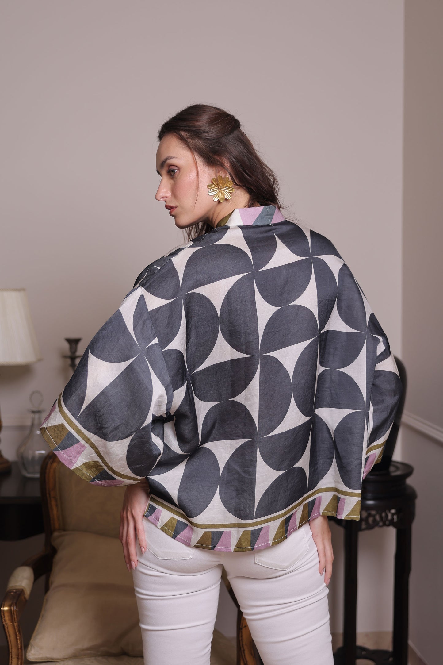 The Vicenza print stands out with its bold black and white geometric pattern, accented by an eye-catching border in olive green and pink, adding a touch of modern flair to any ensemble. Perfect for making a statement with style.